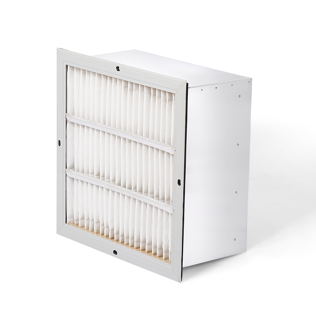 Filter made out of imported non woven compressed felt of 250 grams supported by 1 layer of fine woven mesh on air entry side and 1 layer of heavy duty pvc mesh on air exit side, finally housed in a galvanized / Aluminum frame, flange or box type. All four sides are potted with a special PU resin with sponge effect. 100% media is machine pleated to face the max air flow turbulence during operations.